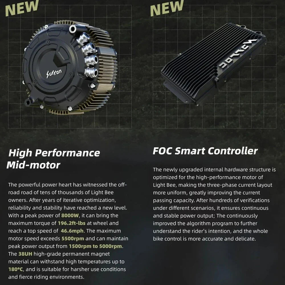 The cutting-edge PMSM motor combined with the state-of-the-art FOC Sinewave Controller delivers an exhilarating 8000 watts of power and a remarkable 196.2 ft-lbs of torque directly to the wheel, guaranteeing exceptional performance on all terrains.