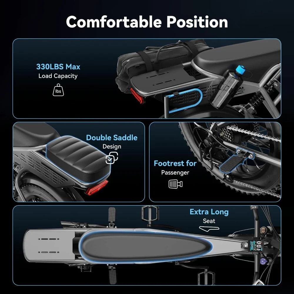 [Safety & Stability for Exceptional Riding Experience]-The full front & rear suspension system of this fat tire electric bike, absorbs most of the bumps and vibrations during riding. Whether on bumpy terrain or city streets, e-bike for adults electric ensures comfort and stability. The dual disc braking system can provide powerful braking capabilities and precise instant braking speed even on slippery roads, ensuring your safety at all times.